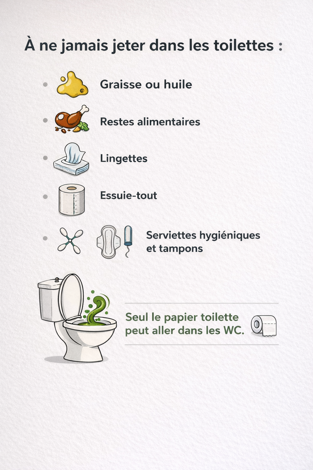 Voici un panneau très simple mais important : Ce qu'il ne faut pas jeter dans ses toilettes !